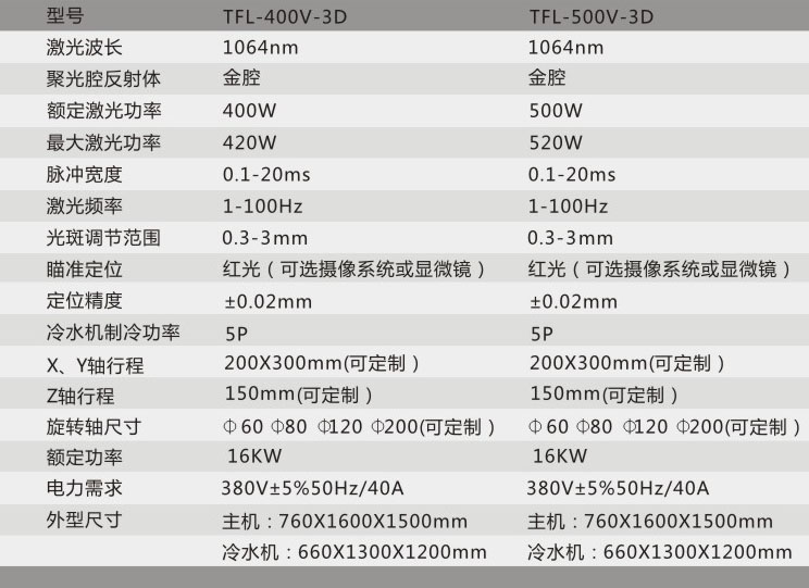 1、TFL-400V/500V-3D,由雙路氙燈泵浦、進(jìn)口陶瓷反射腔體及Nd:YAG晶體棒構(gòu)成激光器,電光轉(zhuǎn)換效率高。